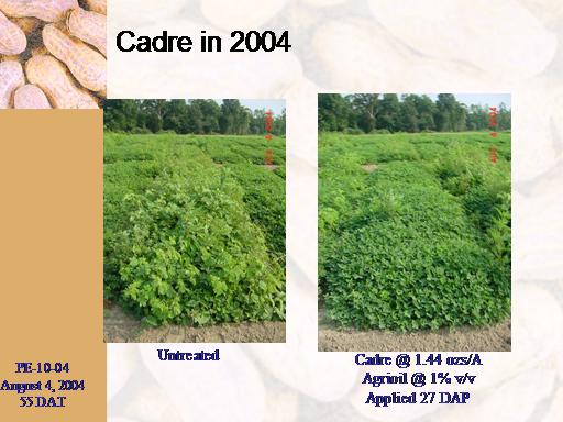 Cadre in 2004<BR>PE-10-04 <BR>August 4, 2004 <BR>55 DAT<BR>Untreated<BR>Cadre @ 1.44 ozs/A <BR>Agrioil @ 1% v/v <BR>Applied 27 DAP<BR>