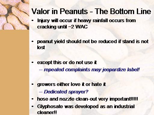 Valor in Peanuts - The Bottom Line<BR>Injury will occur if heavy rainfall occurs from cracking until ~2 WAC  <BR> <BR>peanut yield should not be reduced if stand is not lost <BR> <BR>except this or do not use it <BR>repeated complaints may jeopardize label! <BR> <BR>growers either love it or hate it <BR>Dedicated sprayer? <BR>hose and nozzle clean-out very important!!!!! <BR>Glyphosate was developed as an industrial cleaner!!<BR>