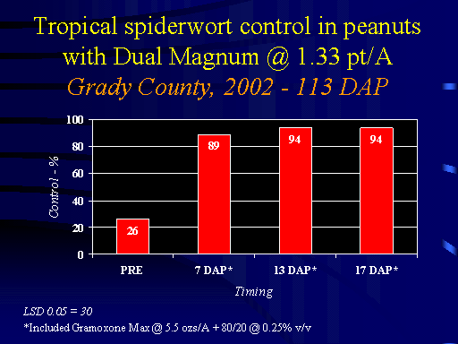 Tropical spiderwort control in peanuts with Dual Magnum @ 1.33 pt/A Grady County, 2002 - 113 DAP<BR>LSD 0.05 = 30<BR>*Included Gramoxone Max @ 5.5 ozs/A + 80/20 @ 0.25% v/v<BR>