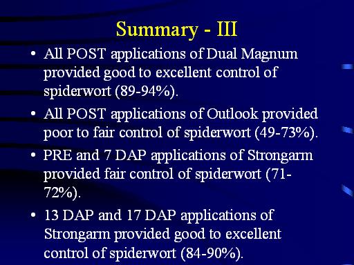Summary - III<BR>All POST applications of Dual Magnum provided good to excellent control of spiderwort (89-94%).