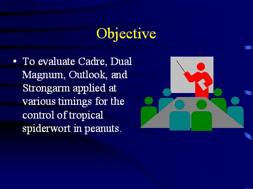 Objective<BR>To evaluate Cadre, Dual Magnum, Outlook, and Strongarm applied at various timings for the control of tropical spiderwort in peanuts.<BR>