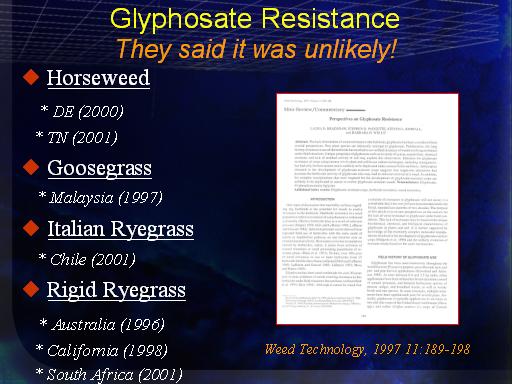 Glyphosate ResistanceThey said it was unlikely!<BR> Horseweed