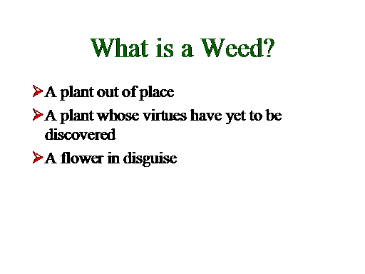 What is a Weed?<BR>A plant out of place <BR>A plant whose virtues have yet to be discovered <BR>A flower in disguise<BR>