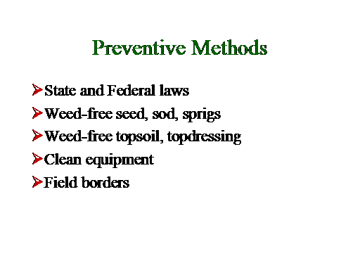 Preventive Methods<BR>State and Federal laws <BR>Weed-free seed, sod, sprigs <BR>Weed-free topsoil, topdressing <BR>Clean equipment <BR>Field borders<BR>