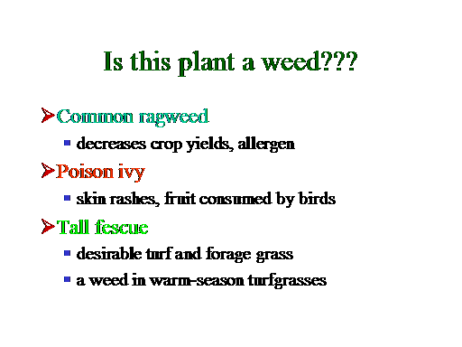 Is this plant a weed???<BR>Common ragweed <BR>decreases crop yields, allergen <BR>Poison ivy <BR>skin rashes, fruit consumed by birds <BR>Tall fescue <BR>desirable turf and forage grass <BR>a weed in warm-season turfgrasses<BR>