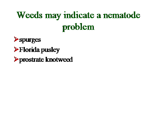 Weeds may indicate a nematode problem<BR>spurges <BR>Florida pusley <BR>prostrate knotweed<BR>