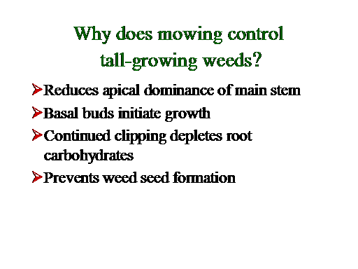 Why does mowing control  tall-growing weeds?<BR>Reduces apical dominance of main stem <BR>Basal buds initiate growth <BR>Continued clipping depletes root carbohydrates <BR>Prevents weed seed formation<BR>