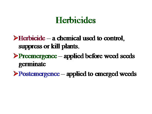 Herbicides<BR>Herbicide – a chemical used to control, suppress or kill plants. <BR>Preemergence – applied before weed seeds germinate <BR>Postemergence – applied to emerged weeds<BR>