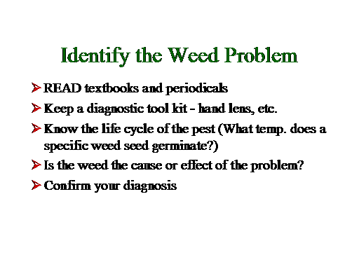 Identify the Weed Problem<BR>READ textbooks and periodicals <BR>Keep a diagnostic tool kit - hand lens, etc. <BR>Know the life cycle of the pest (What temp. does a specific weed seed germinate?)  <BR>Is the weed the cause or effect of the problem? <BR>Confirm your diagnosis<BR>