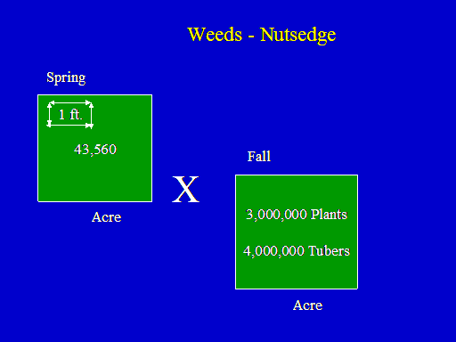 Weeds - Nutsedge<BR>Spring<BR>43,560<BR>1 ft.<BR>Acre<BR>X<BR>3,000,000 Plants <BR> <BR>4,000,000 Tubers<BR>Fall<BR>Acre<BR>