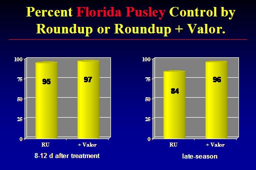 Percent Florida Pusley Control by Roundup or Roundup + Valor.  <BR>8-12 d after treatment<BR>late-season<BR>95<BR>97<BR>84<BR>96<BR>