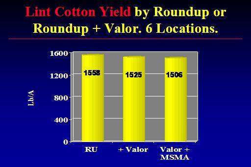 Lint Cotton Yield by Roundup or Roundup + Valor. 6 Locations. <BR>1558<BR>1525<BR>Lb/A<BR>1506<BR>