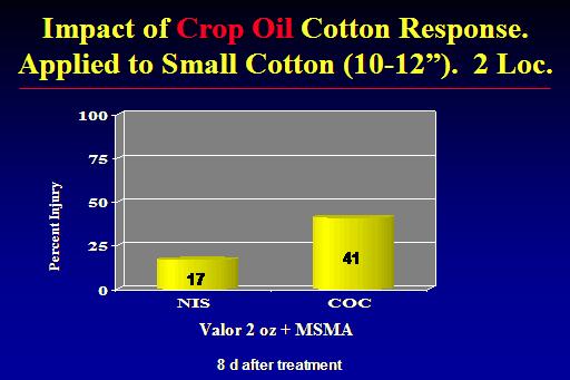 Impact of Crop Oil Cotton Response.  Applied to Small Cotton (10-12”).  2 Loc.<BR>8 d after treatment<BR>17<BR>41<BR>Percent Injury<BR>Valor 2 oz + MSMA<BR>
