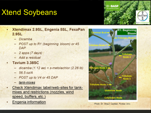Xtend Soybeans<BR>Xtendimax 2.9SL, Engenia 5SL, FexaPan 2.9SL <BR>Dicamba <BR>POST up to R1 (beginning  bloom) or 45 DAP <BR>2 apps (7 days) <BR>Add a residual <BR>Tavium 3.38SC <BR>dicamba (1.12 ae) + s-metolachlor (2.26 lb)  <BR>56.5 oz/A <BR>POST up to V4 or 45 DAP <BR>tank-mixes <BR>Check Xtendimax label/web-sites for tank-mixes and restrictions (nozzles, wind speed, buffers, etc.) <BR>Engenia information <BR> <BR> <BR>Photo: Dr. Shaun Casteel, Purdue Univ.<BR>