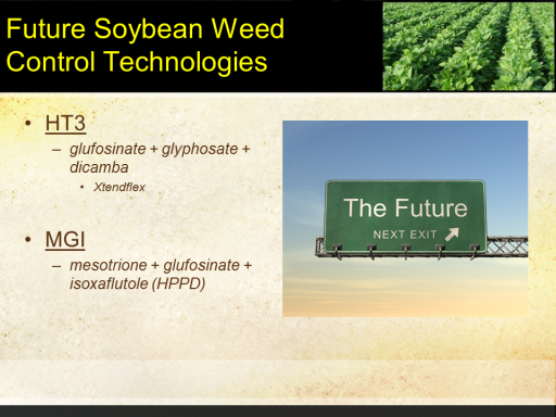 Future Soybean Weed Control Technologies<BR>HT3 <BR>glufosinate + glyphosate + dicamba <BR>Xtendflex <BR> <BR>MGI <BR>mesotrione + glufosinate + isoxaflutole (HPPD)<BR>
