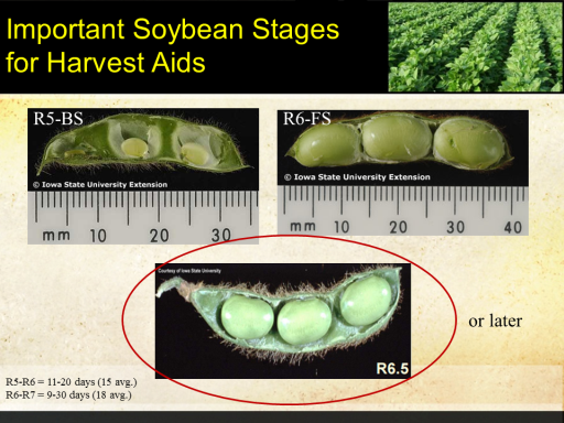 Important Soybean Stages for Harvest Aids<BR>R5-BS<BR>R6-FS<BR> or later<BR>R5-R6 = 11-20 days (15 avg.) <BR>R6-R7 = 9-30 days (18 avg.)<BR>
