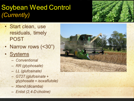 Soybean Weed Control (Currently)<BR>Start clean, use residuals, timely POST <BR>Narrow rows (<30”) <BR>Systems <BR>Conventional <BR>RR (glyphosate) <BR>LL (glufosinate) <BR>GT27 (glufosinate + glyphosate + isoxaflutole) <BR>Xtend (dicamba) <BR>Enlist (2,4-D choline)<BR>