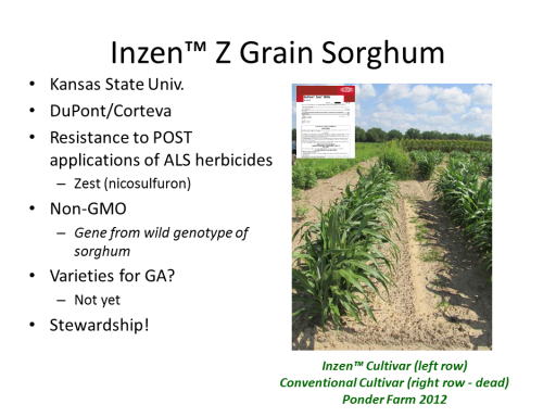 Inzen™ Z Grain Sorghum<BR>Kansas State Univ. <BR>DuPont/Corteva <BR>Resistance to POST applications of ALS herbicides <BR>Zest (nicosulfuron) <BR>Non-GMO <BR>Gene from wild genotype of sorghum <BR>Varieties for GA? <BR>Not yet <BR>Stewardship! <BR>Inzen™ Cultivar (left row) <BR>Conventional Cultivar (right row - dead) <BR>Ponder Farm 2012<BR>