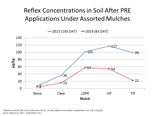 Reflex Concentrations in Soil After PRE Applications Under Assorted Mulches<BR>*Myakka sand (1% OM, 6.8 pH; 95% sand, 4% silt, 1% clay); Reflex concentration at application was 139-176 µg/kg <BR>Source: Reed et al.  2017.  Weed Science (FL)<BR>