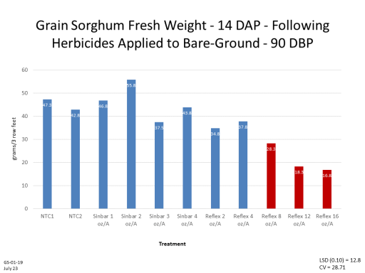 Grain Sorghum Fresh Weight - 14 DAP - Following Herbicides Applied to Bare-Ground - 90 DBP<BR>grams/3 row feet<BR>Treatment<BR>LSD (0.10) = 12.8 <BR>CV = 28.71<BR>GS-01-19 <BR>July 23<BR>