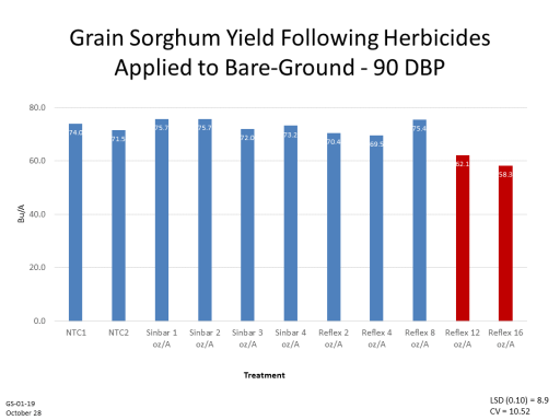 Grain Sorghum Yield Following Herbicides Applied to Bare-Ground - 90 DBP<BR>Bu/A<BR>Treatment<BR>LSD (0.10) = 8.9 <BR>CV = 10.52<BR>GS-01-19 <BR>October 28<BR>