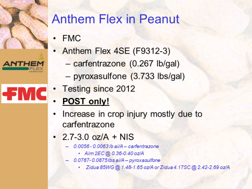 Anthem Flex in Peanut<BR>FMC <BR>Anthem Flex 4SE (F9312-3) <BR>carfentrazone (0.267 lb/gal) <BR>pyroxasulfone (3.733 lbs/gal) <BR>Testing since 2012 <BR>POST only! <BR>Increase in crop injury mostly due to carfentrazone <BR>2.7-3.0 oz/A + NIS <BR>0.0056 - 0.0063 lb ai/A – carfentrazone <BR>Aim 2EC @ 0.36-0.40 oz/A <BR>0.0787- 0.0875 lbs ai/A – pyroxasulfone <BR> Zidua 85WG @ 1.48-1.65 oz/A or Zidua 4.17SC @ 2.42-2.69 oz/A <BR>