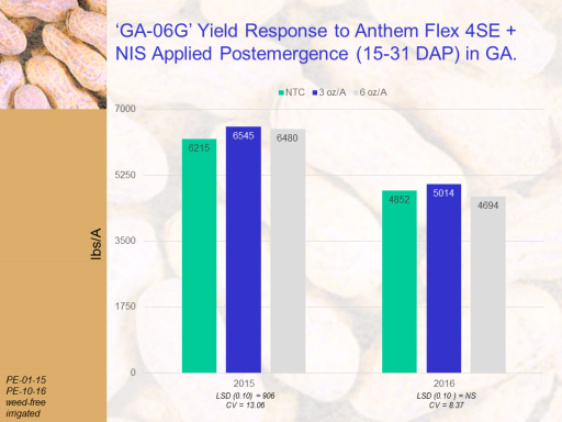 ‘GA-06G’ Yield Response to Anthem Flex 4SE + NIS Applied Postemergence (15-31 DAP) in GA.<BR>PE-01-15 <BR>PE-10-16 <BR>weed-free <BR>irrigated<BR>LSD (0.10) = 906 <BR>CV = 13.06<BR>LSD (0.10 ) = NS <BR>CV = 8.37<BR>lbs/A<BR>