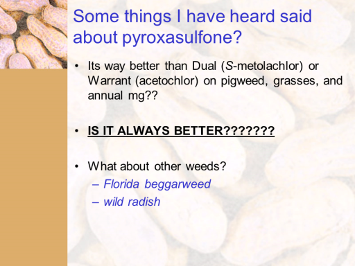 Some things I have heard said about pyroxasulfone?<BR>Its way better than Dual (S-metolachlor) or Warrant (acetochlor) on pigweed, grasses, and annual mg??  <BR> <BR>IS IT ALWAYS BETTER??????? <BR> <BR>What about other weeds? <BR>Florida beggarweed <BR>wild radish<BR>