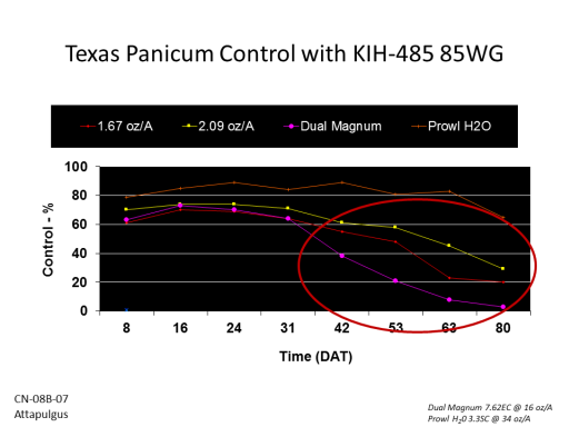 Texas Panicum Control with KIH-485 85WG<BR>CN-08B-07 <BR>Attapulgus<BR>Dual Magnum 7.62EC @ 16 oz/A <BR>Prowl H20 3.3SC @ 34 oz/A<BR>