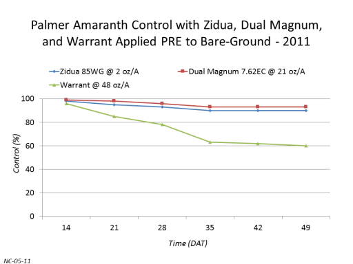 Palmer Amaranth Control with Zidua, Dual Magnum, and Warrant Applied PRE to Bare-Ground - 2011<BR>Time (DAT)<BR>Control (%)<BR>NC-05-11<BR>