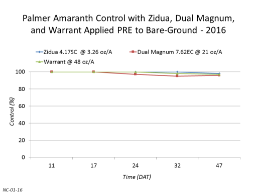 Palmer Amaranth Control with Zidua, Dual Magnum, and Warrant Applied PRE to Bare-Ground - 2016<BR>Time (DAT)<BR>Control (%)<BR>NC-01-16<BR>