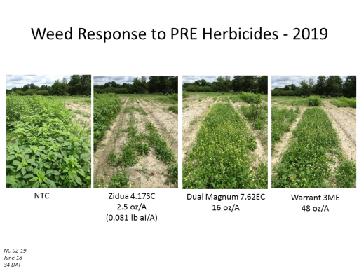 Weed Response to PRE Herbicides - 2019<BR>NC-02-19 <BR>June 18 <BR>34 DAT<BR>NTC<BR>Zidua 4.17SC <BR>2.5 oz/A <BR>(0.081 lb ai/A)<BR>Dual Magnum 7.62EC <BR>16 oz/A<BR>Warrant 3ME <BR>48 oz/A<BR>