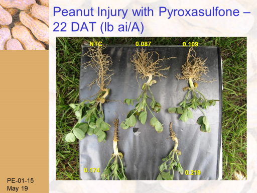 Peanut Injury with Pyroxasulfone – 22 DAT (lb ai/A)<BR>NTC<BR>0.087 <BR>0.109<BR>0.174<BR>0.219<BR>PE-01-15 <BR>May 19<BR>