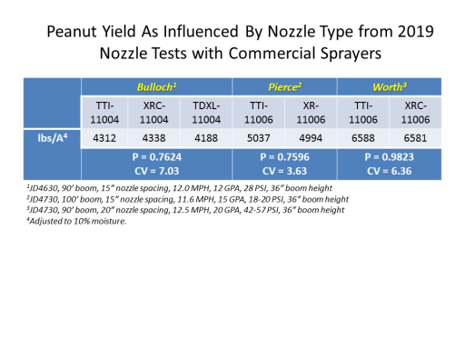Peanut Yield As Influenced By Nozzle Type from 2019 Nozzle Tests with Commercial Sprayers<BR>1JD4630, 90’ boom, 15” nozzle spacing, 12.0 MPH, 12 GPA, 28 PSI, 36” boom height <BR>2JD4730, 100’ boom, 15” nozzle spacing, 11.6 MPH, 15 GPA, 18-20 PSI, 36” boom height <BR>3JD4730, 90’ boom, 20” nozzle spacing, 12.5 MPH, 20 GPA, 42-57 PSI, 36” boom height <BR>4Adjusted to 10% moisture.<BR>