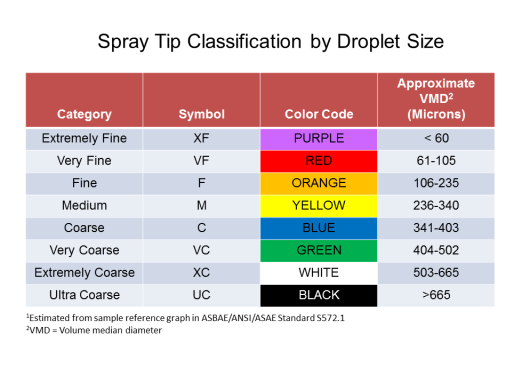 Spray Tip Classification by Droplet Size <BR>1Estimated from sample reference graph in ASBAE/ANSI/ASAE Standard S572.1 <BR>2VMD = Volume median diameter<BR>