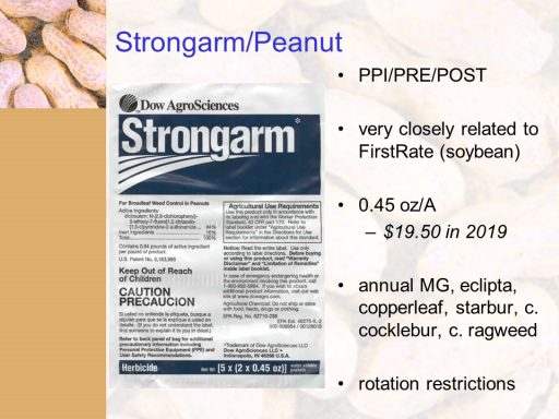 Strongarm/Peanut<BR>PPI/PRE/POST <BR> <BR>very closely related to FirstRate (soybean) <BR> <BR>0.45 oz/A <BR>$19.50 in 2019 <BR> <BR>annual MG, eclipta, copperleaf, starbur, c. cocklebur, c. ragweed <BR> <BR>rotation restrictions <BR>