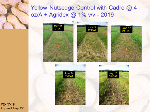 Yellow Nutsedge Control with Cadre @ 4 oz/A + Agridex @ 1% v/v - 2019<BR>PE-17-19 <BR>Applied May 22<BR>May 31 <BR>9 DAT<BR>June 3 <BR>12 DAT<BR>June 12 <BR>21 DAT<BR>June 24 <BR>33 DAT<BR>July 16 <BR>55 DAT<BR>