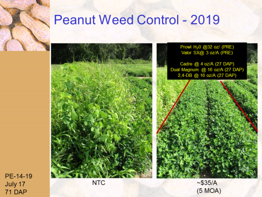 Peanut Weed Control - 2019<BR>PE-14-19 <BR>July 17 <BR>71 DAP<BR>NTC<BR>Prowl H20 @32 oz/ (PRE) <BR>Valor SX@ 3 oz/A (PRE) <BR> <BR>Cadre @ 4 oz/A (27 DAP) <BR>Dual Magnum @ 16 oz/A (27 DAP) <BR>2,4-DB @ 16 oz/A (27 DAP)<BR>~$35/A <BR>(5 MOA)<BR>