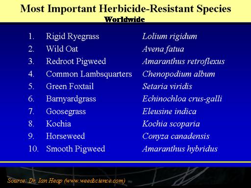 Notes: This slide lists the most important herbicide resistant weed species in the world at this point in time. These weeds are included in this list because of the number of herbicides that they have developed resistance to and/or the speed at which they developed the resistance. It is interesting to note that most of these weeds produce large amounts of seed and have unique dispersal mechanisms. Also, two of the ten species in this list are in the genus Amaranthus. |