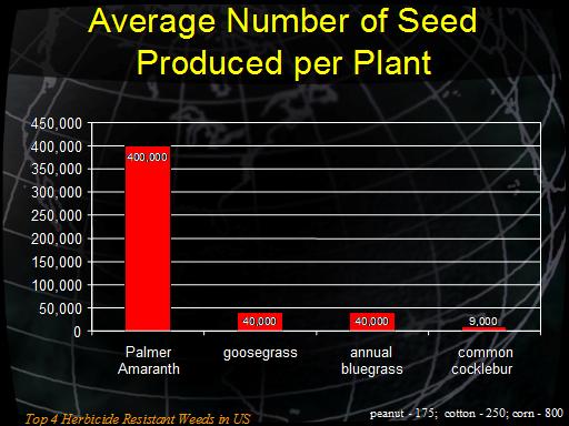 This chart illustrates the potential seed production of the top 4 herbicide resistant weeds in the U.S. It is interesting to note that these weeds produce significantly more seed than cultivated crops such as peanut, cotton, and corn.
