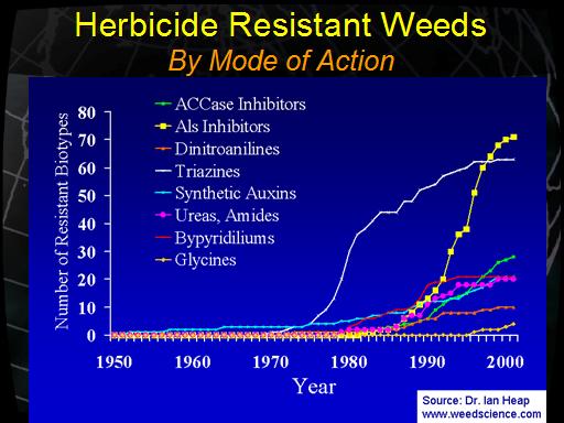 Notes: This slides illustrates the increase in the number of herbicide resistant weed biotypes by herbicide family. The two herbicide families with the most resistant biotypes are the triazines and the ALS-inhibitors. This is due to the fact that the triazine herbicides have been used for more than 46 years while the ALS herbicides have single sites of action and are among the most popular herbicides used today. |