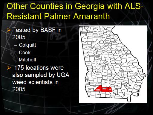 Notes: In 2005, BASF identified the presence of ALS-resistant Palmer amaranth in the following counties in Georgia: Colquitt, Cook, and Mitchell. Also, UGA weed scientists collected pigweed seed from 175 locations around the state to test for glyphosate and ALS resistance. Results of these tests will be made available as soon as possible. |