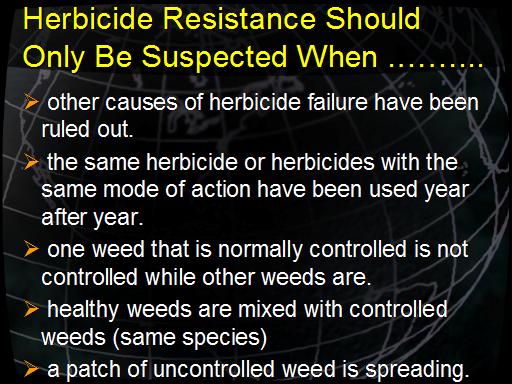 Notes: How do you know if you have a herbicide resistance problem? Herbicide resistance should only be suspected when 1) other causes of herbicide failure have been ruled out; 2) the same herbicide or herbicides with the same mode of action have been used year after year; 3) one weed that is normally controlled is not controlled while other weeds are; 4) healthy weeds are mixed with controlled weeds (same species); and 5) a patch of uncontrolled weeds is spreading. Herbicide resistance should be confirmed by collecting seed from a suspect plant and subjecting the plants grown from this seed to various rates of the suspect herbicide(s) by your local extension or research specialist. |