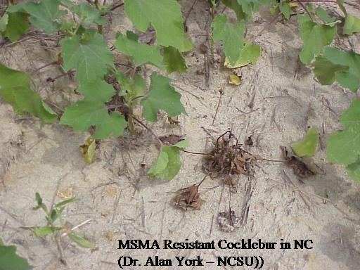 This slide shows an MSMA resistant common cocklebur population in North Carolina. Notice that some treated plants are dead while others are not injured. This is a classic field example of a herbicide resistant weed population.