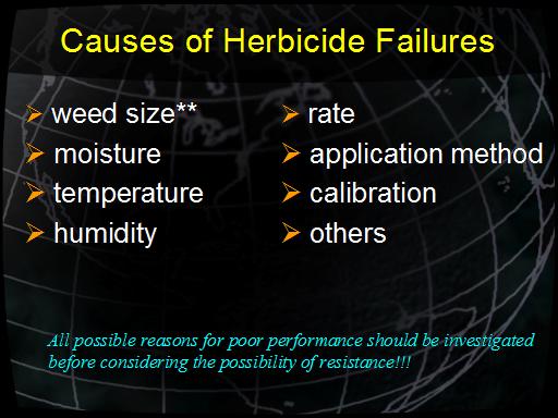 Notes: Since herbicide resistance is not a problem that affects every crop acre, most herbicide failures can be attributed to other factors. Usually, herbicide failures are the result of unfavorable environmental conditions and/or untimely application (i.e. large weeds) rather than herbicide resistance. All possible reasons for poor performance should be investigated before herbicide resistance is considered! |