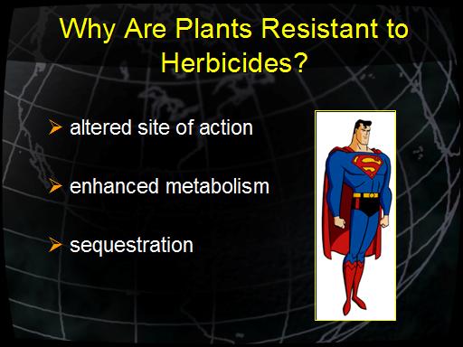 Notes: There are 3 known mechanisms by which plants develop resistance to herbicides. The first and most common mechanism is an altered site of action. Most herbicides have a specific site of action in the plant and any change in this site will cause the herbicide to be inactive (more information in slide 5). The second mechanism is enhanced metabolism. Simply put, enhanced metabolism means that the plants have the natural ability to degrade or metabolize the herbicide into a non-active compound. The third and least common mechanism for resistance is called sequestration. With sequestration, the plant has the ability to prevent the herbicide from reaching its site of action by limiting its movement. This mechanism is also called compartmentalization. |