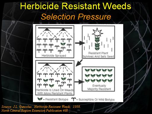 Notes: Herbicide resistance develops in a field because of a process known as selection pressure. Herbicide resistant weed biotypes already exist in any given population of weeds but usually are not present in large numbers. The resistant population becomes dominant only after the repeated use of a single herbicide or herbicides with the same mode of action removes the susceptible population and allows the resistant population to survive and produce seed. |
