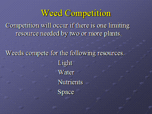 Weed Competition<BR>Competition will occur if there is one limiting resource needed by two or more plants. <BR> <BR>Weeds compete for the following resources. <BR>				    Light <BR>				    Water <BR>				    Nutrients <BR>				    Space<BR>