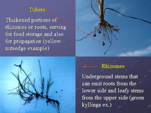 Tubers <BR>Thickened portions of rhizomes or roots, serving for food storage and also for propagation (yellow nutsedge example)<BR>Rhizomes <BR>Underground stems that can emit roots from the lower side and leafy stems from the upper side (green kyllinga ex.)<BR>