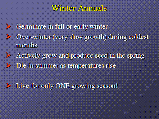 Winter Annuals  <BR>Germinate in fall or early winter <BR>Over-winter (very slow growth) during coldest months <BR>Actively grow and produce seed in the spring <BR>Die in summer as temperatures rise <BR> <BR>Live for only ONE growing season!<BR>